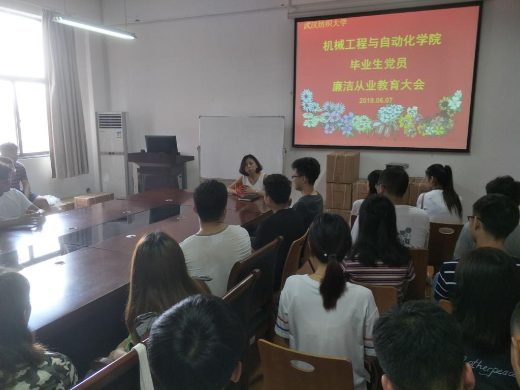 6月7日上午11时,williamhill英国中文在8E411召开毕业生党员廉洁从业教育大会,大会由williamhill英国中文党委副书记卫冬妹主持,毕业生辅导员王双喜老师、梁祥云老师以及所有毕业生党员参加了大会。