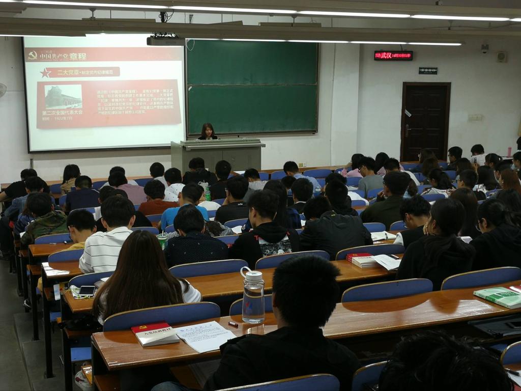 刘戈教授首先介绍了什么是党章以及党章的发展演变史,通过对党章的阐释让大家加深了对中国共产党的认识,随后刘戈教授向大家介绍了十九大对党章修改的主要内容以及重大意义。她强调:党章是党的总章程,集中体现了党的性质和宗旨、党的理论和路线方针政策、党的重要主张,规定了党的重要制度和体制机制,是全党必须共同遵守的根本行为规范。最后刘教授希望所有学员要自觉学习党章、遵守党章、贯彻党章、维护党章,争取早日入党。