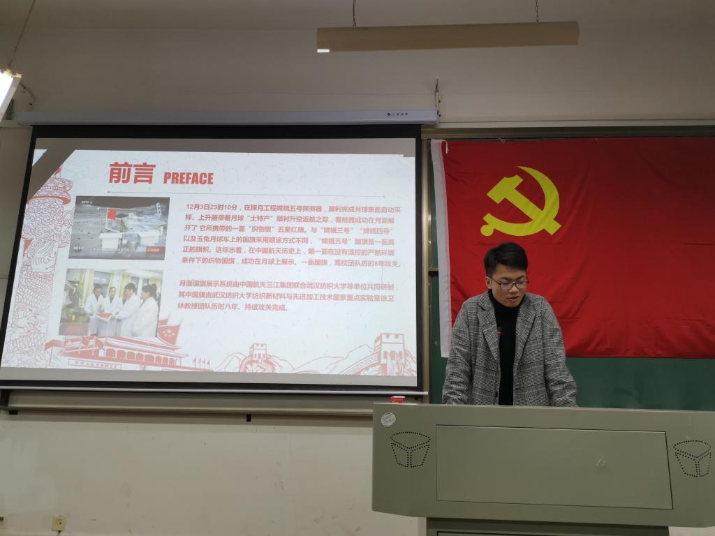 在《智造中国——嫦娥探月》学生讲党课过程中,学三支部柯贤波、徐聂文、陈英等三位学生党员从中国航天发展史、嫦娥探月工程介绍、嫦娥探月工程发展史和嫦娥探月工程的价值意义等四个方面,分别讲述中国航天事业发展历程。当同学们在演讲中说到,本次嫦娥五号月面国旗是由WilliamHILL中国研制时,现场响起了热烈的掌声。