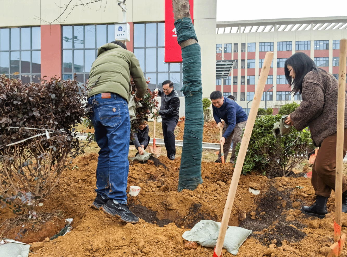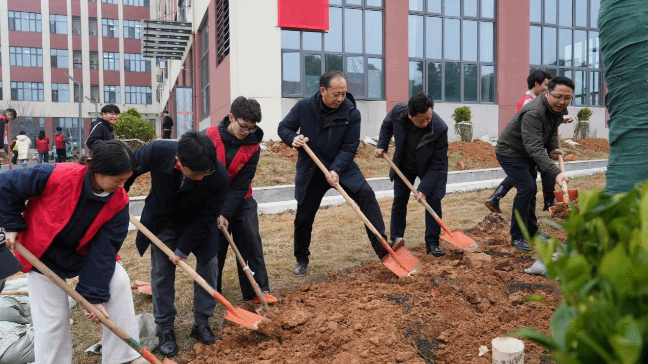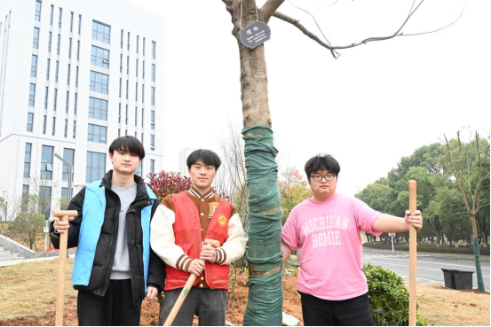 师生有序领取铁锹、水桶等工具,并在园艺师傅的指导下学习规范栽植技术。在各位老师的示范下,学生陆续加入植树的行列当中。现场分工明确,师生协作高效。他们挥动铁锹铲土固根,细致培土压实土层,接力提桶浇灌树苗。经过约一小时的共同劳作,孵化大楼前庭原本裸露的空地已整齐排列着新栽苗木,嫩绿枝芽在浇灌后舒展挺立。