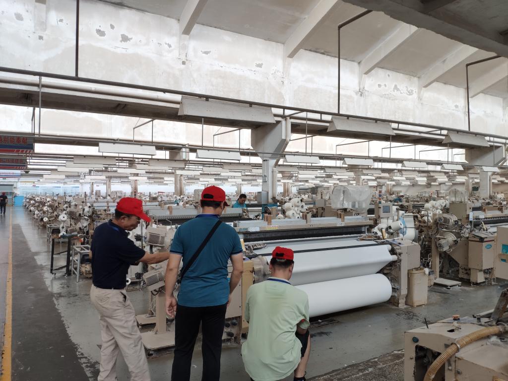 际华三五四二纺织有限公司唐建东部长带领余院长一行在织造车间和准备车间考察,在车间现场测量了相关工艺参数。随后双方对自动落布小车实施方案进行了深入细致的交流,就自动落布小车项目技术合同的实施细节达成共识。