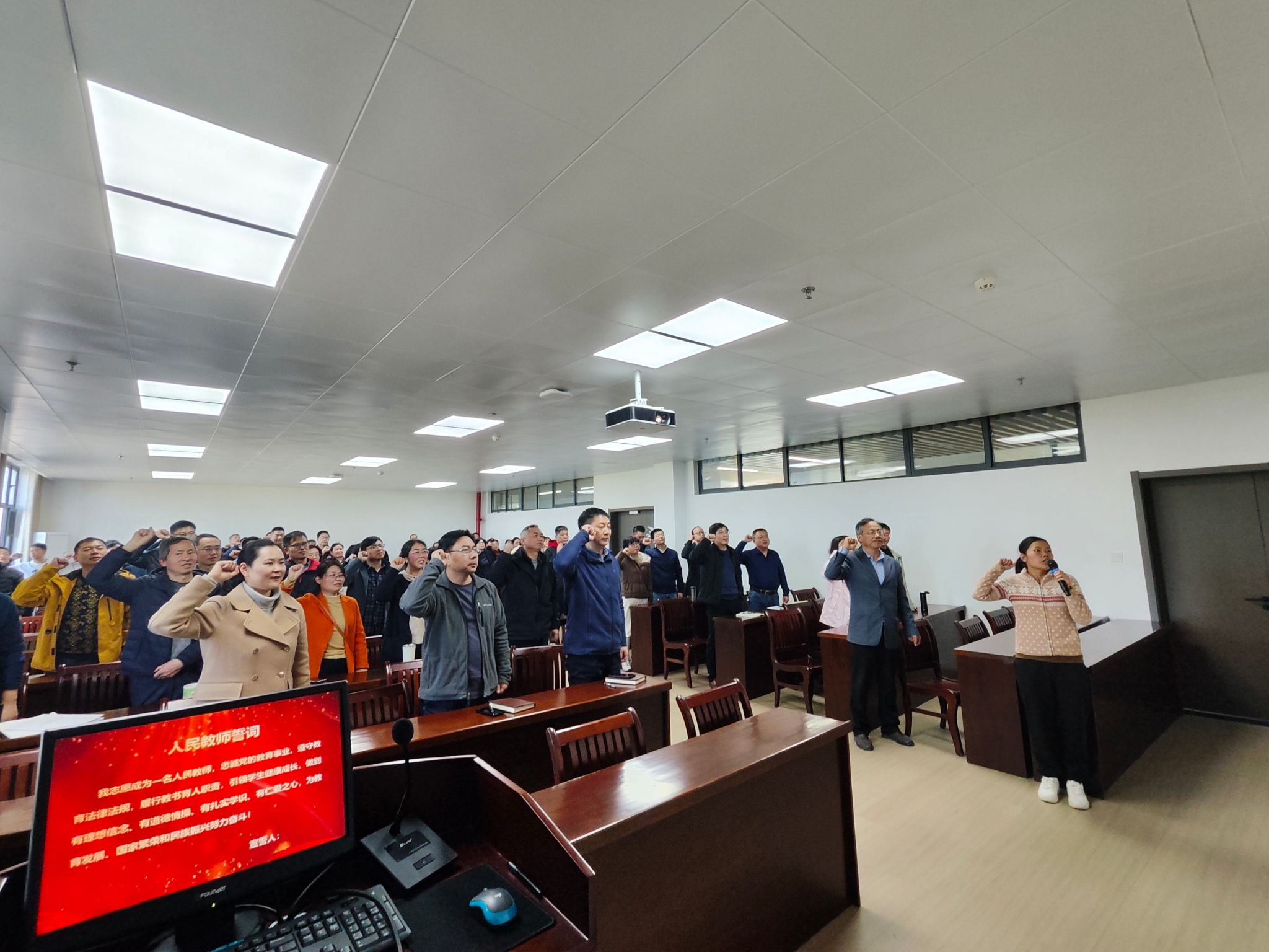 在师德师风专题教育环节,全体教职工集中观看了师德典范纪录片《黄大年》,并重温《人民教师誓词》。通过学习先进事迹、庄严宣誓,引导教师进一步坚定理想信念,强化使命担当,自觉把爱国情怀、敬业精神和育人责任融入教育教学全过程。