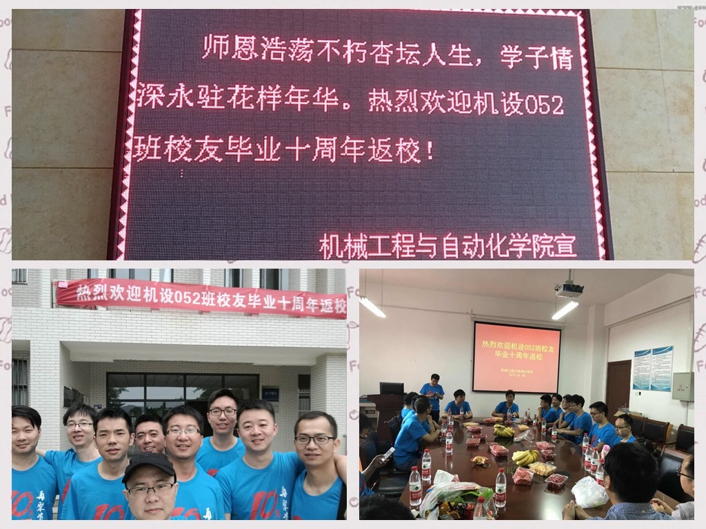 为了重温大学同学情谊,加强校友与母校间的联系,6月8日正值端午假期,机设052班校友在毕业十周年后重聚母校,并于上午九点整在阳光校区8E411成功开展返校主题班会。