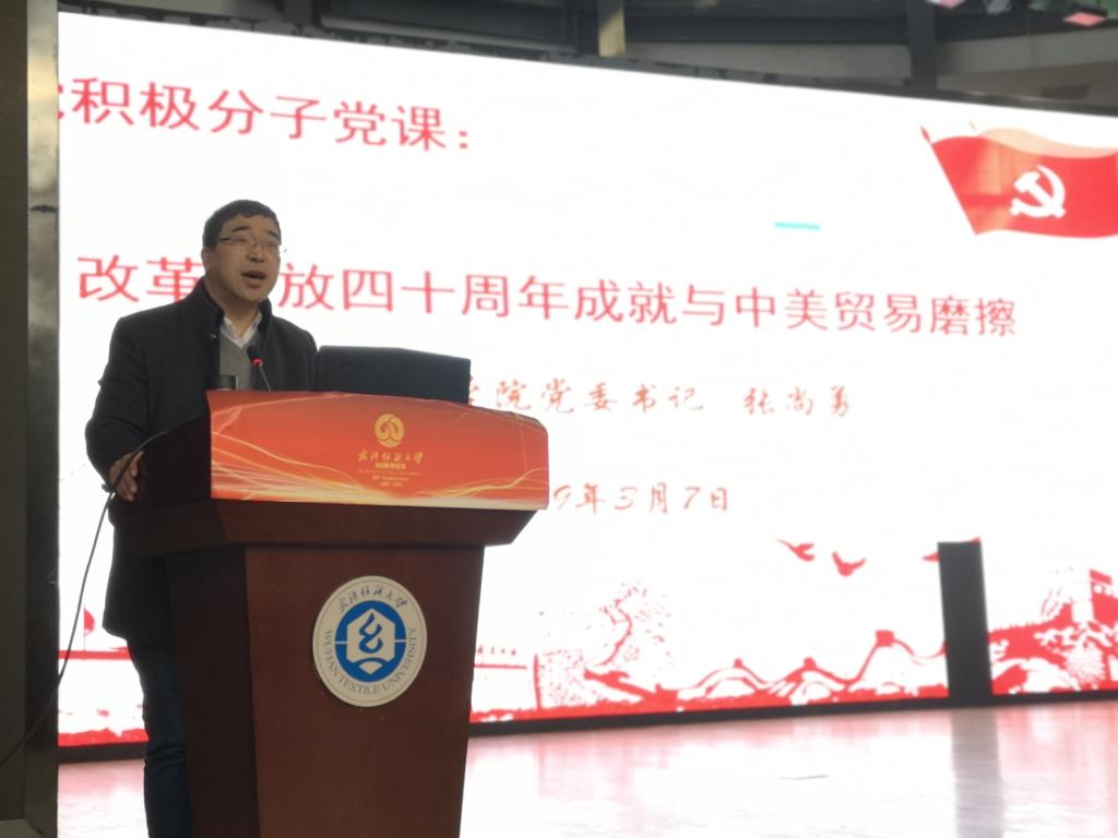 典礼结束后,纺织学院党委书记张尚勇为所有学员讲授了党校第一课——《改革开放四十周年成就与中美贸易摩擦》。