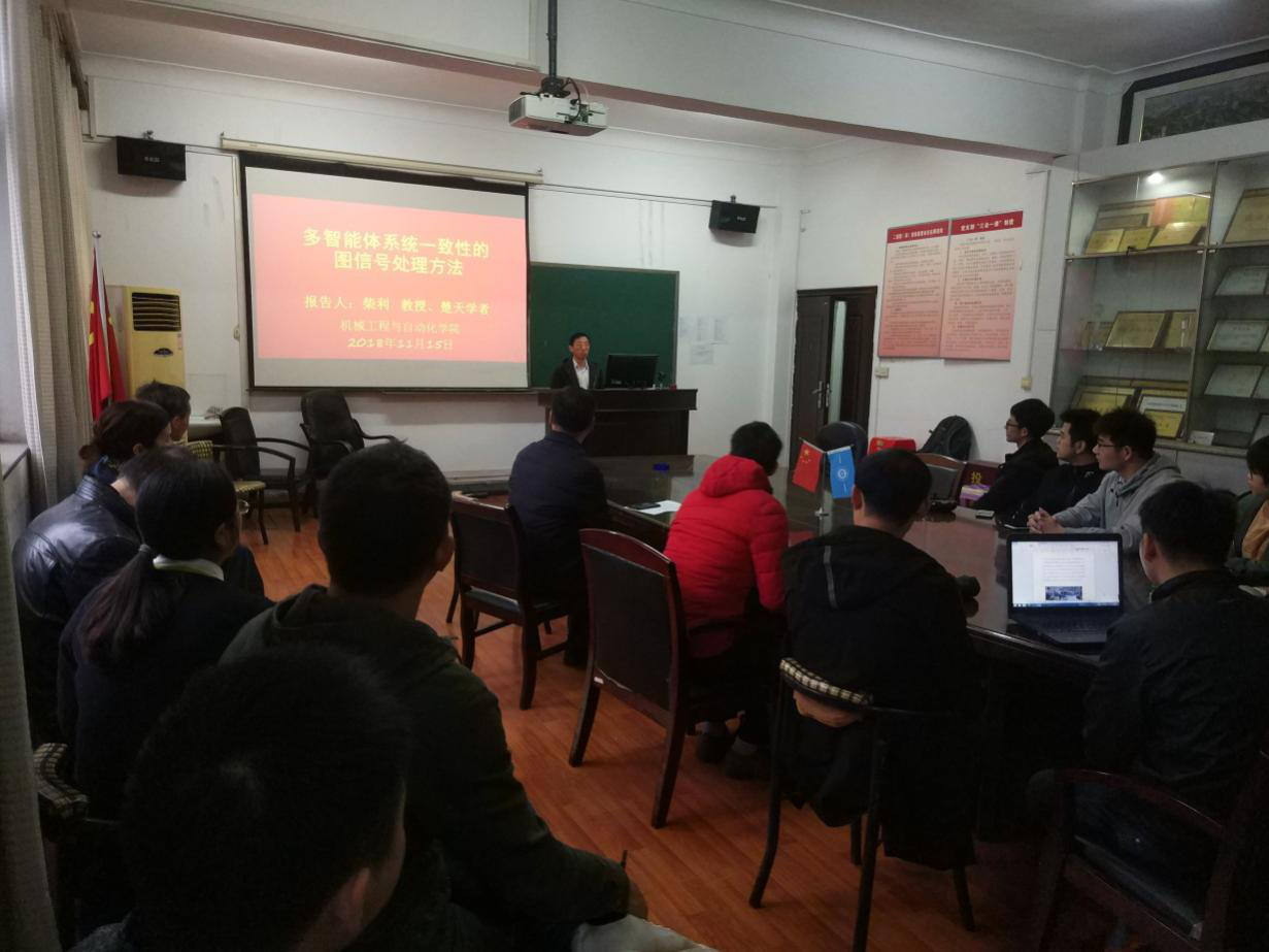 11月15日上午,武汉科技大学信息科学与工程学院柴利教授受邀来到机械工程与自动化学院,与我院师生进行了以《多智能体系统一致性的图信号处理方法》为主题的学术交流。williamhill英国中文院长余联庆教授、副院长马双宝副教授、部分教师以及全院研究生参与交流。交流会由余联庆院长主持。