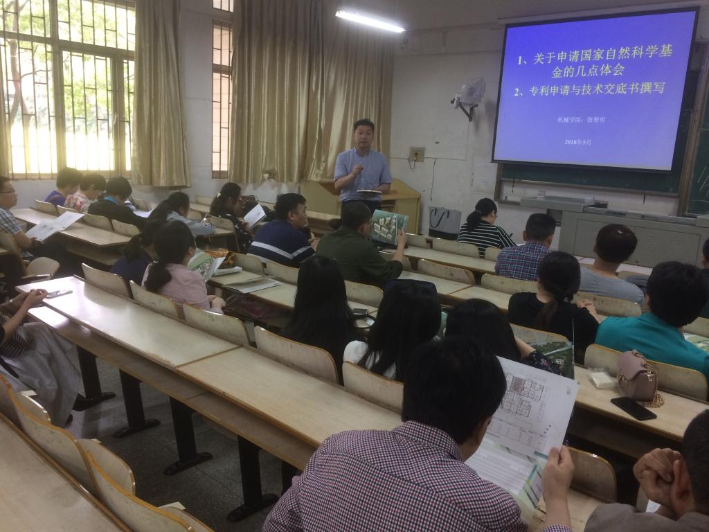 机械电子系主任张智明副教授介绍了自己在申请国家自然科学基金过程中的心得体会,从项目申请书的选题、摘要的撰写、技术方案和技术路线的设计以及项目组成员的构成等多个方面进行了详细分析和讲解。接着,张主任向大家介绍了专利申请与技术交底书的撰写技巧。