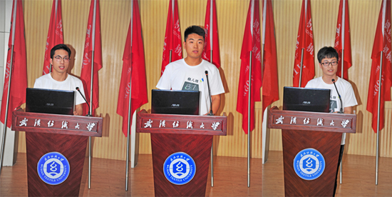随后,曾任第四期铁人班轮值班长和团支书的学员代表储奎、向志伟和鲁亮同学,代表铁人班成员分别作第四期铁人班整体情况汇报、活动开展情况汇报和成员思想成长情况汇报。3位同学从不同侧面把铁人班2年来同学们积极参加早自习、晚锻炼、科技创新及要求进步等方面的情况做了详细展示,充分诠释了“干净、立志、合作、坚持”的班训,和“铁的身体,铁的意志,铁的纪律”的机械铁人精神。