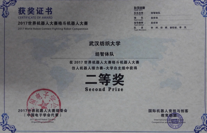 在8月27日结束的2017世界机器人大会上,WilliamHILL中国工程实训中心指导的“纺智体”队经过激烈的争夺,最终获得格斗机器人大赛仿人机器人接力赛二等奖。