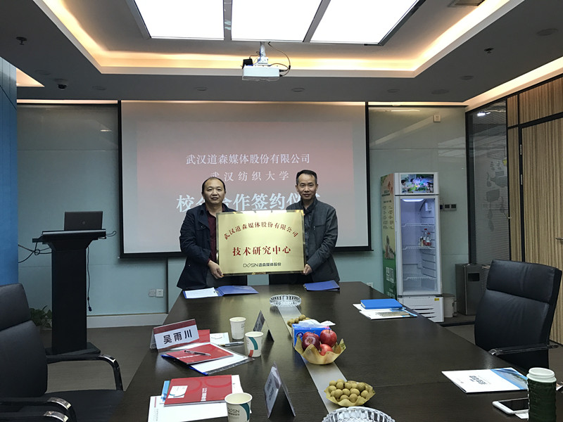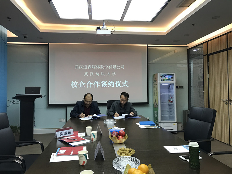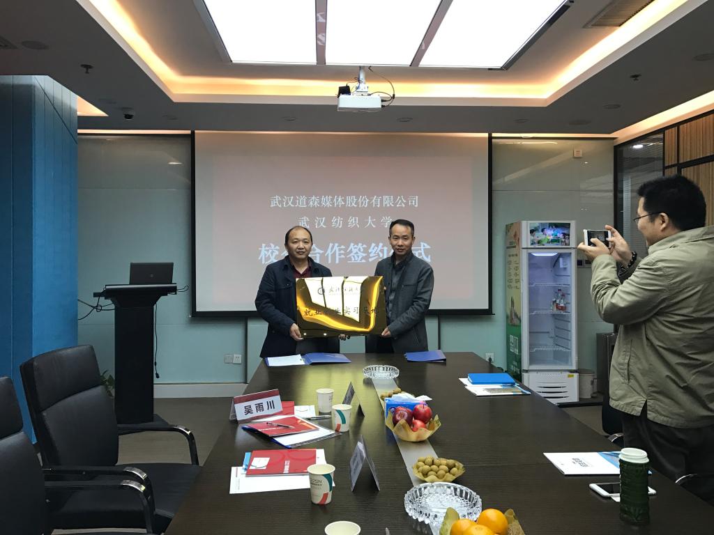 10月26日,武汉纺织大学机械工程与自动化学院与武汉道森媒体股份有限公司在道森传媒总部举行了校企合作签约及授牌仪式。道森传媒董事长杨皆红、副总经理张庆华、首席技术官张学成以及学院执行院长燕怒、副书记卫东妹等一行出席了签约授牌仪式。