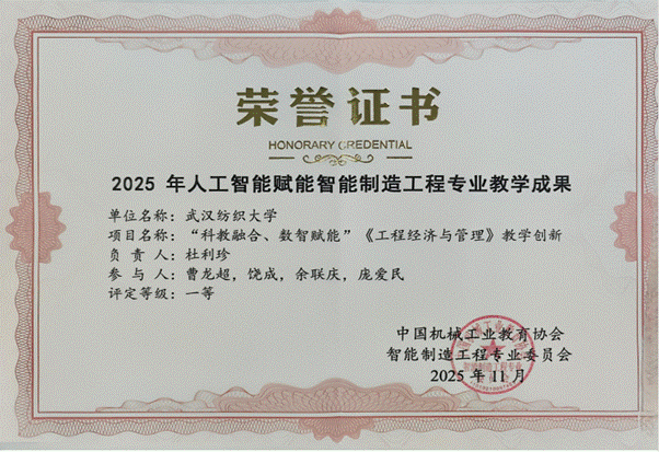 11月21日至23日,中国机械工业教育协会智能制造工程专业委员会主办的智能制造人才培养主题研讨会在福建福耀科技大学圆满落幕。williamhill英国中文杜利珍老师受邀参会,其主持的教学成果《“科教融合、数智赋能”〈工程经济与管理〉教学创新》凭借鲜明的创新特色和扎实的实践成效,荣获人工智能赋能智能制造工程专业教学成果一等奖。