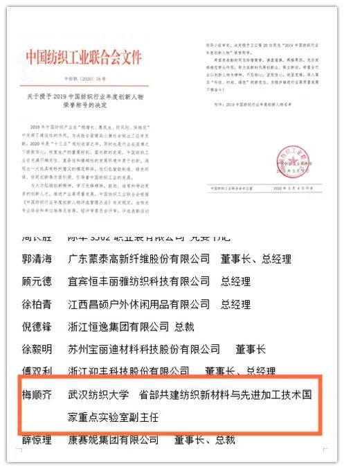 近日,倍受行业关注的“2019年中国纺织行业年度创新人物”评选活动正式揭晓,包括我校梅顺齐教授在内的20名行业精英人物榜上有名,成为全行业疫情之下进行创新突围的学习典范和标杆。