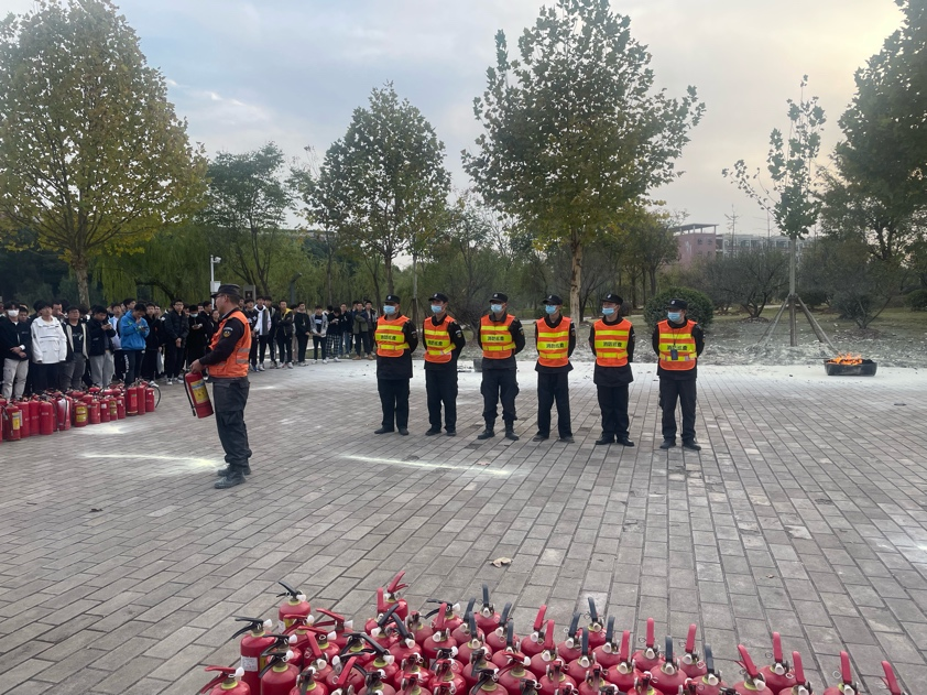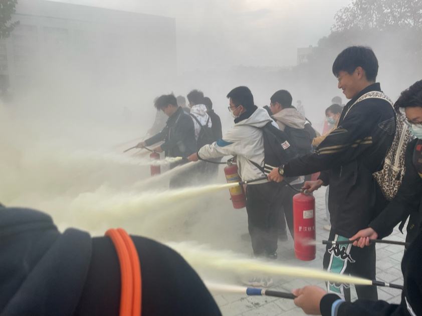 现场的灭火器灭火作业演习,校保卫处的老师通过现场展示向大家生动而详细地介绍了干粉灭火器的使用方法,面对火情,将灭火器取出适当摇匀,拔出栓销,距离1~2m将喷嘴对准火源根部喷射即可。为了让现场的同学掌握灭火器的使用方法,保卫处准备了数十个干粉灭火器供大家练习操作。工作人员在空旷地燃起一堆火焰,同学们分组学习手持灭火器向火源喷射,火势迅速被扑灭。