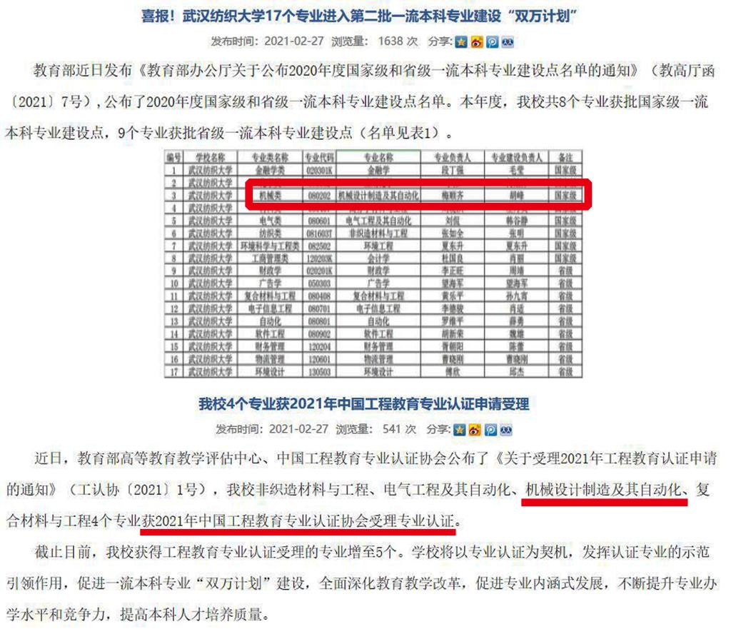 2021年,学院机械设计制造及其自动化专业的工程认证工作获得突破,机械专业顺利通过工程认证受理。2021年,学院机械专业获批为国家一流专业立项建设点,自动化专业获批为湖北省一流专业,机器人工程和工业设计专业为校级一流专业。《中国纺织文化》作为国家级精品公开课程,较好地完成了资源建设和视频录播工作,《纺织工艺与装备》和《数控机床与数控技术》两门课申报了省级一流课程。