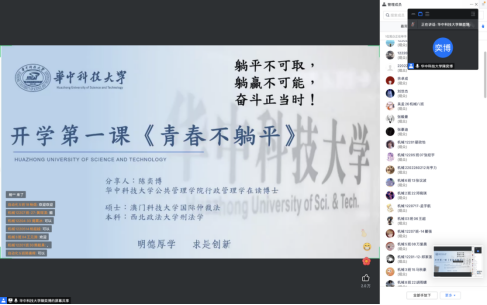 9月11日上午,williamhill英国中文举办成长导航讲座之“青春不躺平”在线上精彩开讲。华中科技大学陈奕博博士应邀参加,与大一新生共话大学生活。williamhill英国中文学生工作负责人和2022级新生辅导员出席此次活动。
