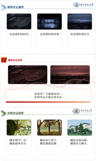 陈奕博博士分享了自己刚入大学时的故事,详细解释了高中与大学、本科生与研究生、硕士与博士的不同,建议新生同学要多读书,不断扩宽自己的知识面。他认为眼界决定视界,视界决定识界,识界决定境界。最后,陈奕博学长鼓励大家在新时代要有更高的站位,要有更深的情怀。