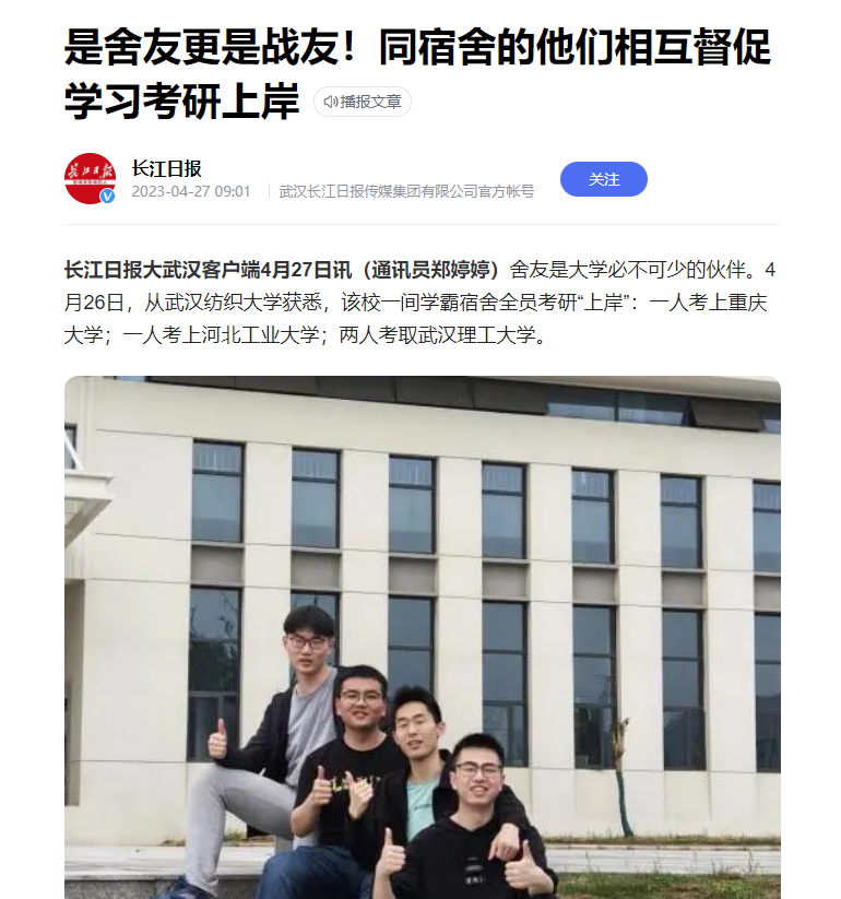 williamhill英国中文学霸宿舍“全员”上岸的新闻在纺大公众号获得了近万点击率,并受到多方媒体关注。近日他们“越努力越幸运”的事迹也登上长江日报《是舍友更是战友!同宿舍的他们相互督促学习考研上岸》。据悉,今年williamhill英国中文在号称“史上最难考研年”中,逆袭而上,取得了历史性突破辉煌成绩。2023届毕业生483人,最终考研“上岸”146人,录取率逾30%,较2022届增加4个百分点。其中,有69人被双一流大学录取,同学们上岸的高校中,不乏中国科学院大学、华中科技大学和武汉大学等超强名校。