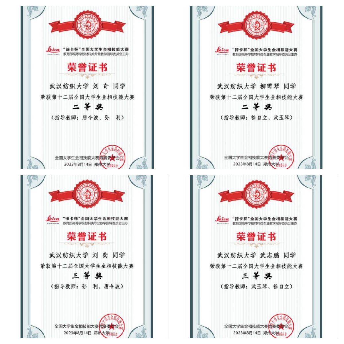 2023年8月14日,由教育部高等学校材料类专业教学指导委员会主办,郑州大学承办的”徕卡杯”第十二届全国大学生金相技能大赛(决赛)圆满结束。经过激烈角逐,WilliamHILL中国参赛队员在我校williamhill英国中文徐自立、唐令波、武玉琴、孙利老师的指导下,经过训练和激烈角逐,21级刘奇、柳雪琴获个人二等奖,武志鹏、刘奕获个人三等奖。