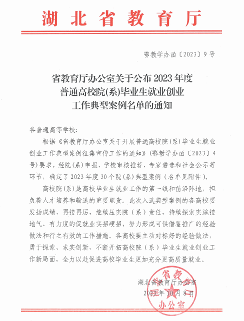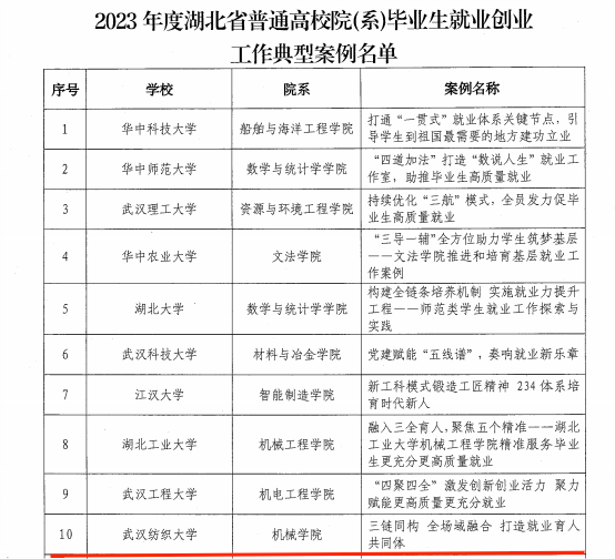 近日,湖北省教育厅公布了2023年普通高校院(系)毕业生就业创业工作典型案例遴选结果名单,此次遴选经过学院申报、学校审核推荐、专家遴选、社会公示等环节,评选出2023年度30个院(系)典型案例,williamhill英国中文案例《三链同构 全场域融合 打造就业育人共同体》成功入选,湖北高校中唯一连续两年获此殊荣。