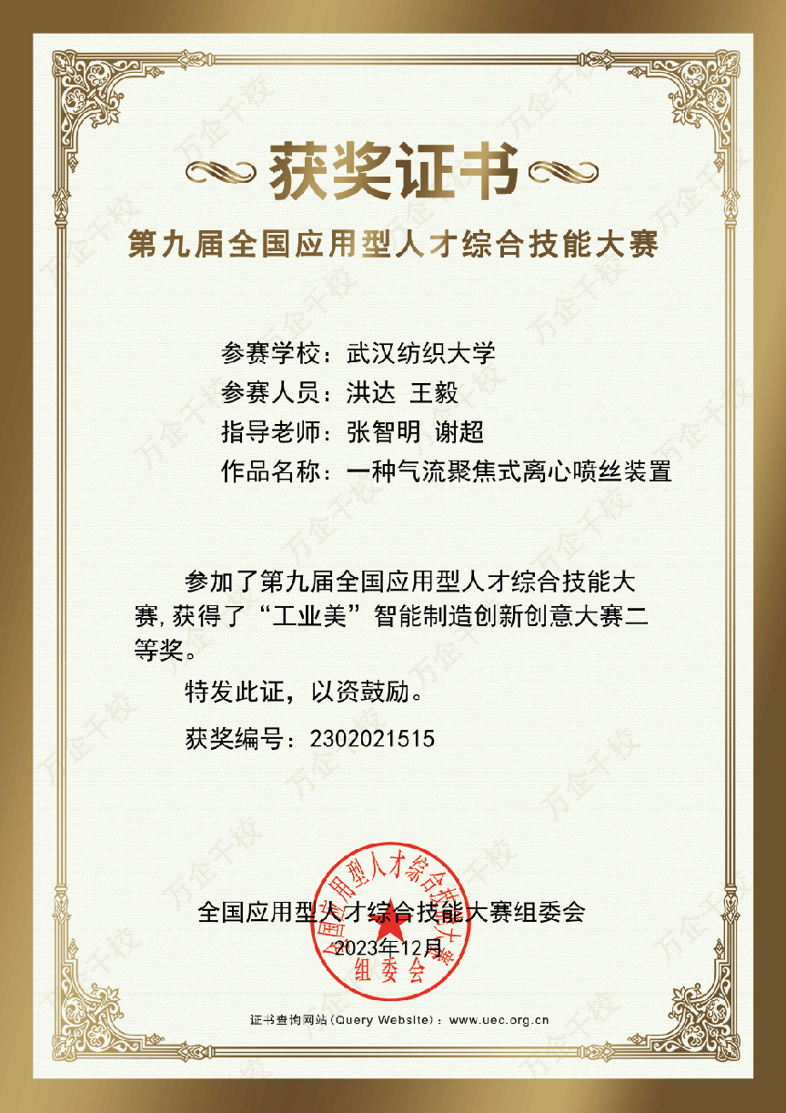 近期第九届全国应用型人才综合技能大赛圆满收官。本次大赛全程采用线上比赛的方式进行,由专家评委进行分组评审。学院高度重视研究生综合素质的培养质量,在张智明教授的指导和谢超老师的支持下,由洪达、王毅组队的参赛作品“一种气流聚焦式离心喷丝装置”和黄新宇、马健玮组队的参赛作品“一种往复式纺丝纤维收集装置”经过重重筛选而脱颖而出,最终荣获了“匠心·工业美”智能制造创新创意大赛二等奖!