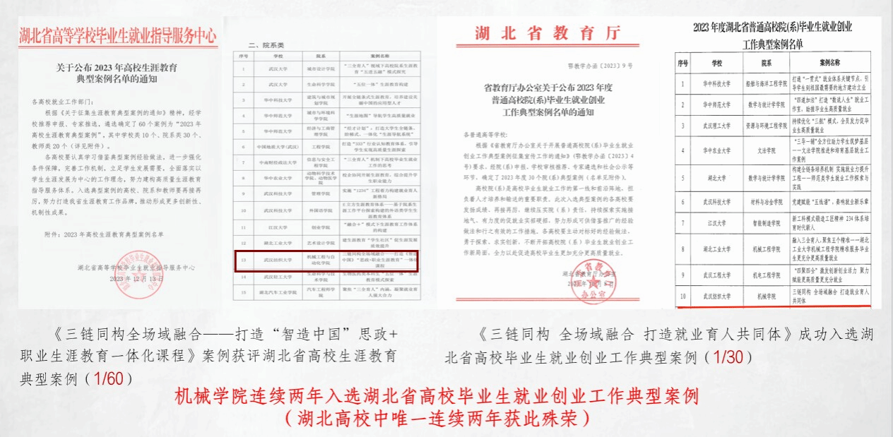 学院23届毕业生实现报考率、升学率和就业率三提升,其中升学率较去年提升6个百分点,考研学霸宿舍等先进个人和集体受到长江日报等媒体关注和报道。学院就业工作连续两年入选湖北省高校毕业生就业创业工作典型案例,一篇入选2023年湖北省高校生涯教育典型案例。