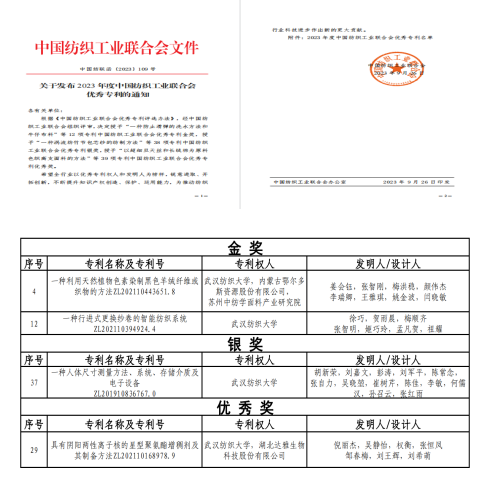 2023年学院获得省级、行业协会科技成果奖励5项,其中湖北省技术发明二等奖1项,中国纺织工业联合会专利金奖1项。学院科研到账连续6年超过1000万元,其中2023年科研到账超1700万元。获批了国家自然科学基金青年项目、湖北省自然科学基金面上项目、武汉市知识创新专项基础项目。