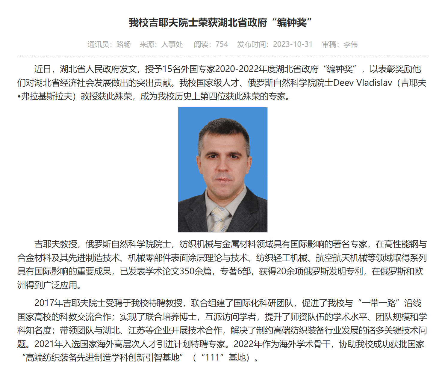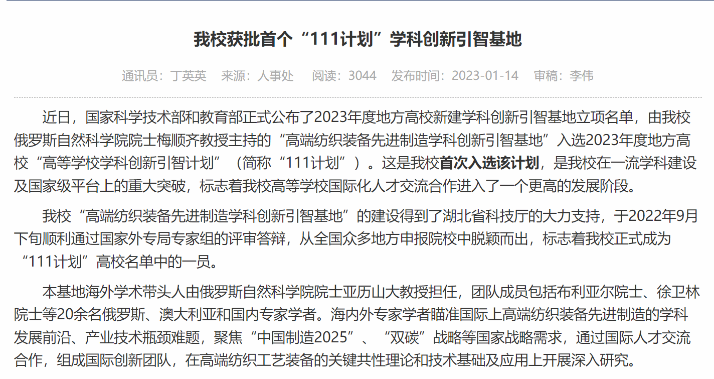 梅顺齐教授主持的“高端纺织装备先进制造学科创新引智基地”入选2023年度地方高校“高等学校学科创新引智计划”(简称“111计划”)。2023年学院积极引进高水平人才团队工作,俄罗斯自然科学院院士吉耶夫·弗拉基斯拉夫荣获湖北省政府“编钟奖”。俄罗斯青年学者温德拉赫获批湖北省“百人计划”人才项目,聘请俄罗斯阿尔泰国立大学谢尔盖教授为兼职教授。