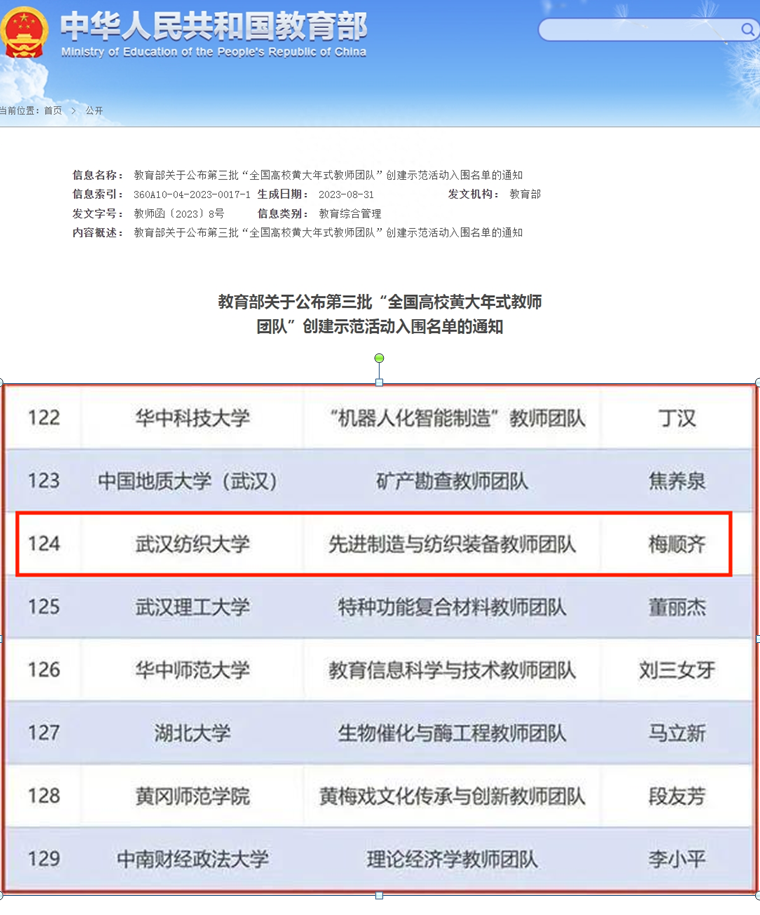 2023年梅顺齐教授领衔的“先进制造与纺织装备教师团队”入选第三批全国高校黄大年式教师团队,是学校历史性的突破,是教师思政与产学研融合的成果。学院紧密围绕纺织装备研究凝练学院研究方向,与华中科技大学长江特聘史铁林教授达成柔性引进协议,作为优化设计方向学科带头人参与后面的项目规划与申报工作。