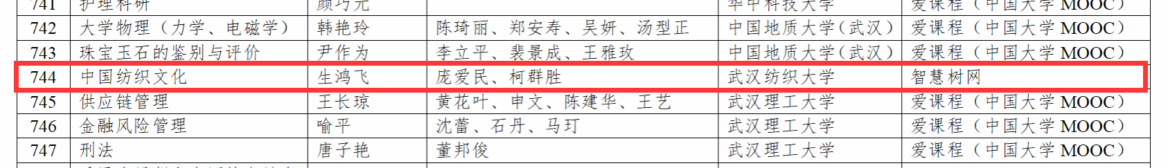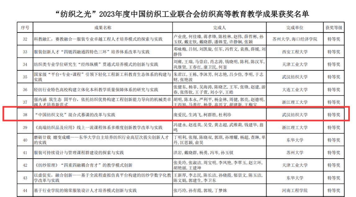 继2022年得2门湖北省一流课程之后,2023年学院获批国家级线上线下混合式一流本科课程1门,湖北省级线上线下混合式一流本科课程1门,实现了国家级一流课程的突破。2023年获中国纺织工业联合会教育教学成果奖特等奖1项,一等奖1项,二等奖2项。