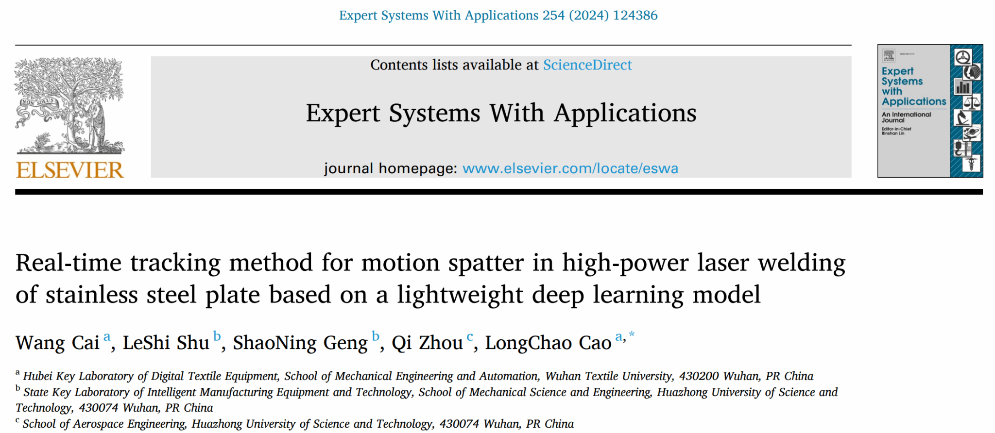 近日,我校机械工程与自动化学院曹龙超博士课题组青年教师蔡旺在激光加工过程智能监测方面取得了重要的研究进展。相关成果以“Real-time tracking method for motion spatter in high-power laser welding of stainless steel plate based on a lightweight deep learning model”为题发表在计算机科学领域中科院一区Top期刊《Expert Systems with Applications》(ISSN:0957-4174)上。该论文的第一单位为WilliamHILL中国,第一作者为williamhill英国中文蔡旺博士,通讯作者为williamhill英国中文曹龙超特聘教授。