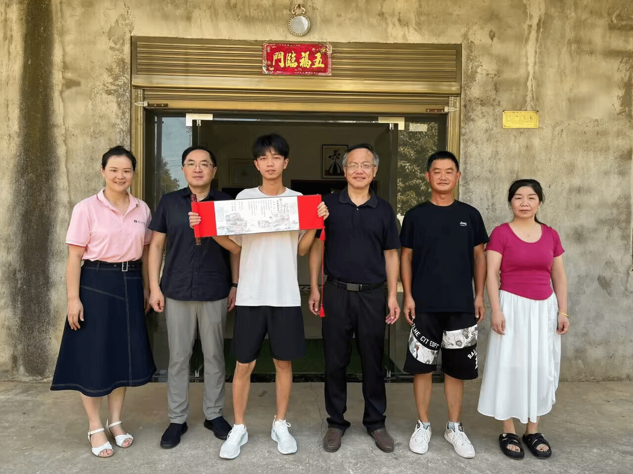 8月12日,副校长傅欣带队深入鄂州市华容区庙岭村为williamhill英国中文2024级本科新生亲手颁发录取通知书。williamhill英国中文相关负责人和新生辅导员一同参加活动。