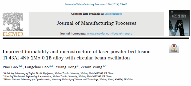 近日,我校机械工程与自动化学院曹龙超课题组青年教师高飘博士在激光增材制造TiAl合金工艺与机理研究方面取得了重要的研究进展。相关成果以“Improved formability and microstructure of laser powder bed fusion Ti-43Al-4Nb-1Mo-0.1B alloy with circular beam oscillation”为题发表在工程技术领域中科院一区Top期刊《Journal of Manufacturing Processes》(ISSN:1526-6125)上。该论文的第一单位为WilliamHILL中国,第一作者为WilliamHILL中国机械工程与自动化学院高飘博士。