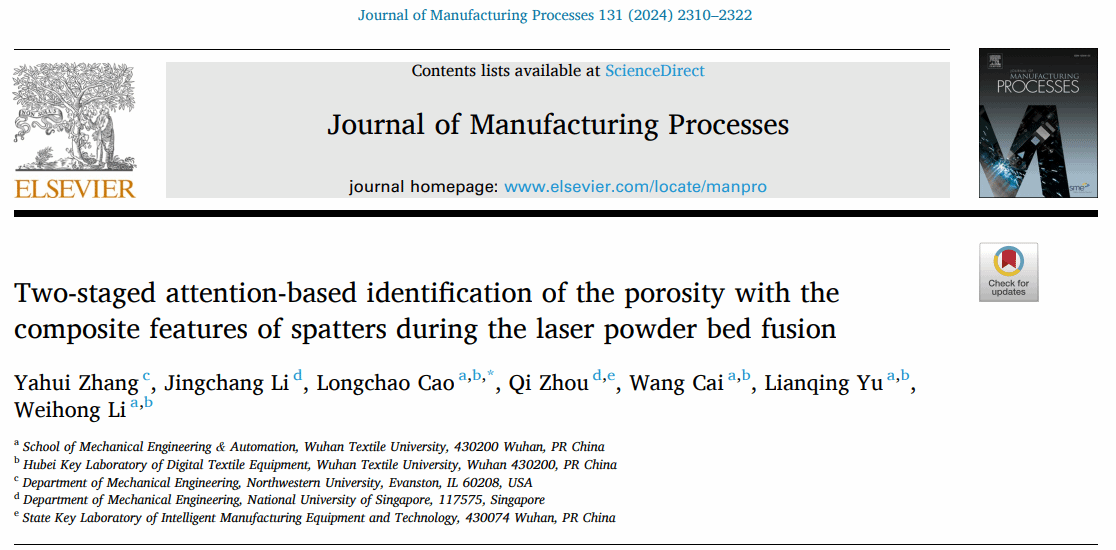 近日,我校机械工程与自动化学院青年教师曹龙超博士与美国西北大学张亚辉博士、新加坡国立大学李京昌博士合作在激光加工智能监测方面取得了重要的研究进展。相关成果以“Two-staged attention-based identification of the porosity with the composite features of spatters during the laser powder bed fusion”为题发表在工程技术领域中科院一区Top期刊《Journal of Manufacturing Processes》(ISSN:1526-6125)上。该论文的第一单位为WilliamHILL中国,曹龙超博士为唯一通讯作者;第一作者为美国西北大学机械系张亚辉博士,其博士毕业于荷兰阿姆斯特丹大学。