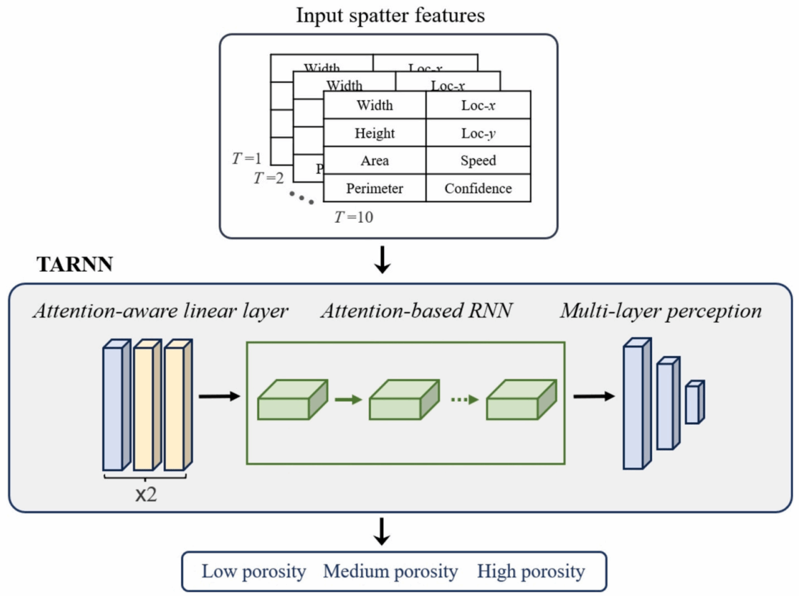 为此,本研究提出了一种结合YOLOv5模型和深度学习的自动化熔池与气监测方法,用于激光增材制造过程中熔池状态的在线监测与缺陷识别。首先,通过训练迁移的YOLOv5模型与DeepSORT算法结合,实现了飞溅的精准分割与跟踪,显著减少了人工处理的时间成本。综合飞溅的静态(面积、周长、宽度、高度)与动态特征(速度、与熔池中心的相对位置、跟踪ID、检测置信度),全面表征了飞溅的动态行为。为进一步提高气孔监测的精度,本文提出了一种双阶段注意力机制的循环神经网络(TARNN),通过多帧时序数据挖掘飞溅行为的时间依赖性。第一阶段的通道注意力机制增强了与气孔特征相关的重要飞溅特征,第二阶段的循环神经网络捕捉到飞溅的时间序列模式,从而显著提高了分类精度。实验结果表明,所提出的方法在飞溅物识别与气孔分类方面具有优越的性能,为激光增材制造过程的智能监测与实时缺陷控制提供了新的技术手段。
