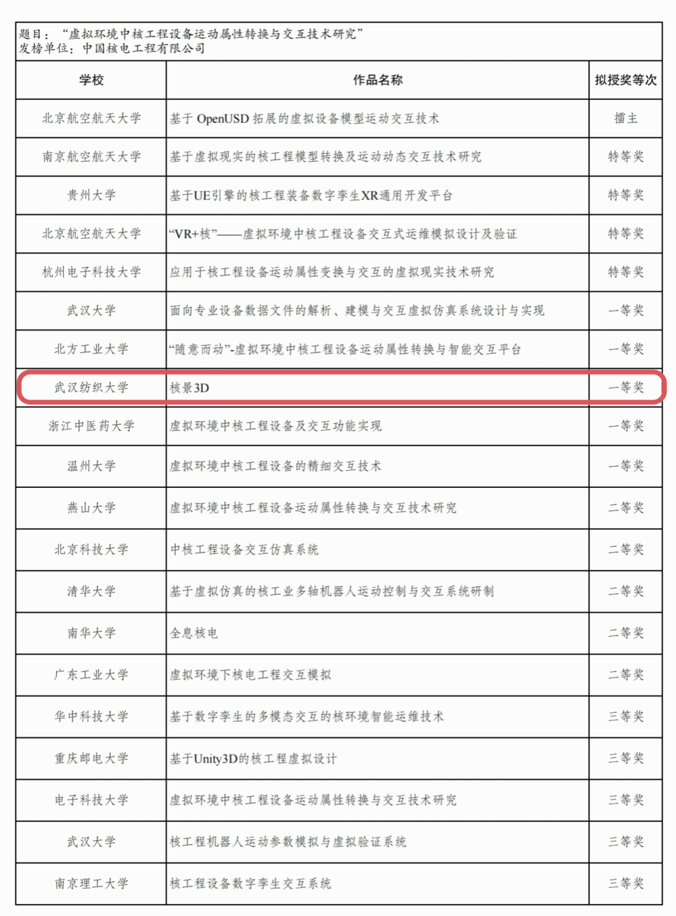 张蒂等同学参赛项目缘于传统核工程设备的运维及管理需要大量人工操作,存在数据复杂、交互效率低下等问题,难以满足现代核工程高效、安全的需求。团队基于虚幻引擎开发平台和数字孪生技术,开展了系统化的设计研发,攻克了CAD模型数据格式转换、模型动作分解及交互设计简化等技术难题,开发出一款基于虚拟现实(VR)的核工程设备模型检视与操作软件《核景3D》。该软件通过多种交互方式,实现了设备的沉浸式观察与操作,项目成果可应用于特种工程领域的虚拟设计,提升设计智能化水平。该项目荣获全国一等奖充分彰显了我院研究生的williamhill水平和创新实践能力。
