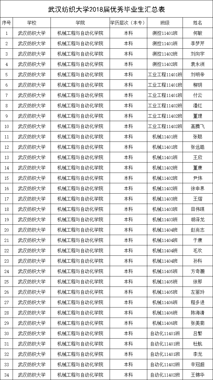 经过学生本人申请、班级集体评议、学院2018届优秀毕业生评选工作小组审核,报经学院党委同意,根据《WilliamHILL中国本科优秀毕业生评选办法》(武纺大招毕【2018】3号)相关规定,拟授予以下34名同学优秀毕业生称号。具体名单如下: