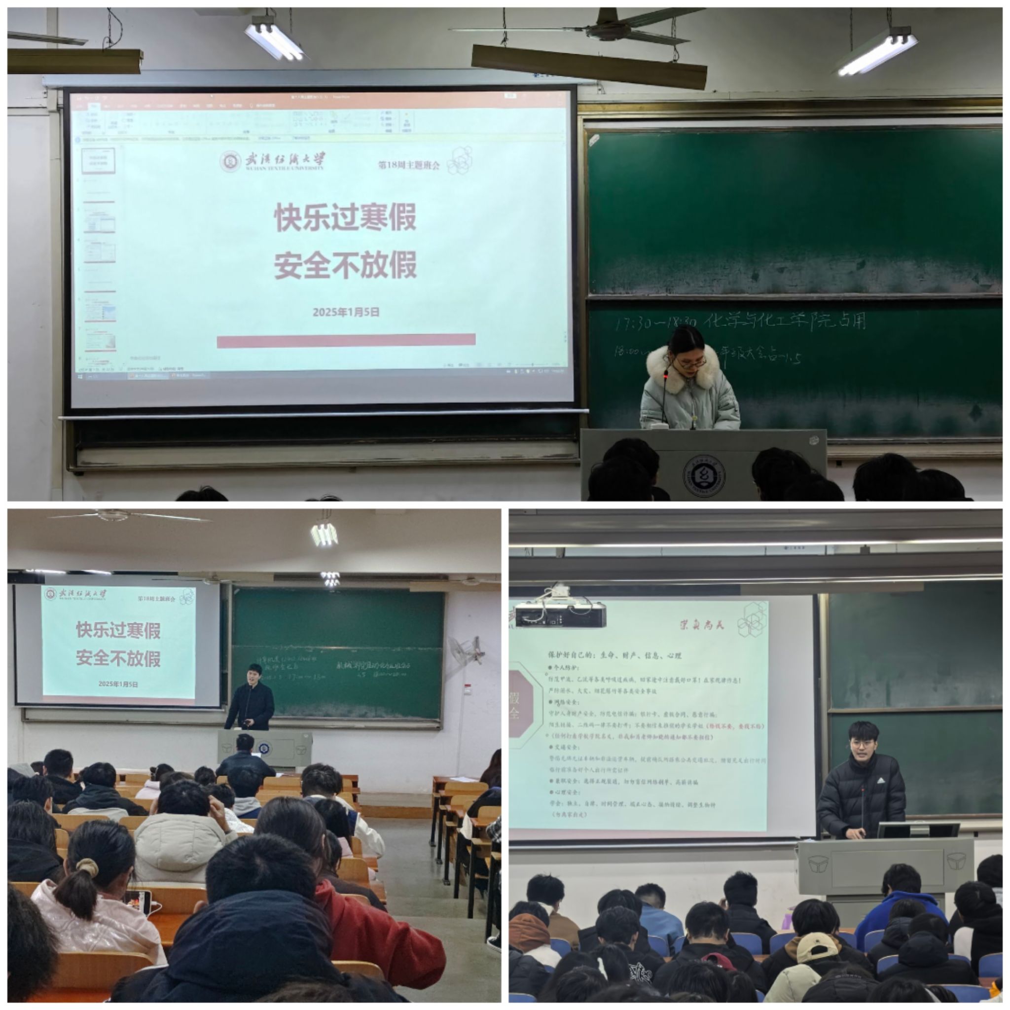 班会开始前,各年级老师进行晚点名确认学生的在校情况,并逐一核实未在校学生的名单及事由。随后,老师们说明了学校2025年寒假放假安排和下学期返校时间等内容,集中组织学习湖北省教育厅发布的《高等学校寒假安全温馨提示》,强调了离校注意事项,提醒学生注意被子衣物防潮,浴室整理,个人位置整理等,尤其是在离开宿舍前要关掉寝室的空调,电灯,检查所有电器,以免漏电,确保寝室安全。同时,老师还提醒同学们注意居家安全、饮食安全、网络安全、外出游玩安全、疾病预防、社交安全、心理健康、假期学习等八个方面,强调交友一定要谨慎,注意个人隐私和信息安全以及在假期期间要有学习规划,树立自己努力的目标。最后,老师希望同学们牢记安全要点,在享受假期欢乐时光的同时确保自身安全,提前祝愿大家新年快乐!