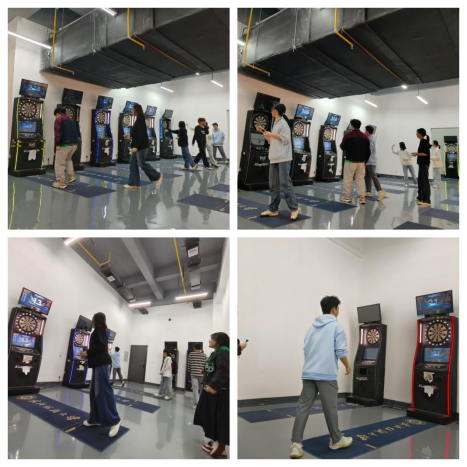 活动伊始,飞镖协会会长热情地向同学们介绍了飞镖运动的起源、发展以及活动规则。从镖盘的分区到投镖的姿势,每一个细节都有着独特的讲究。通过简单而有趣的规则讲解,同学们已经迫不及待地想要一试身手。在体验环节,同学们分成小组轮流进行投镖体验,有的同学一开始略显生疏,飞镖偏离镖盘较远,但他们毫不气馁,在旁边同学的加油声和工作人员的耐心指导下,逐渐调整姿势和力度。而那些上手较快的同学则已经沉浸在飞镖运动带来的成就感之中,每一次精准的投镖都会引起周围阵阵欢呼声。一位参与活动的同学兴奋地表示:“这个飞镖游戏太有趣了,以前从来没玩过。现在感觉自己不仅能锻炼自己的专注力,还能在这个过程中放松心情,和新同学们增进感情。”在小组对抗赛环节,各小组成员之间相互协作、出谋划策,为了团队荣誉全力以赴。活动不仅增强了新生的团队意识,也让他们在竞争中学会了如何应对压力,进一步促进了心理健康发展。