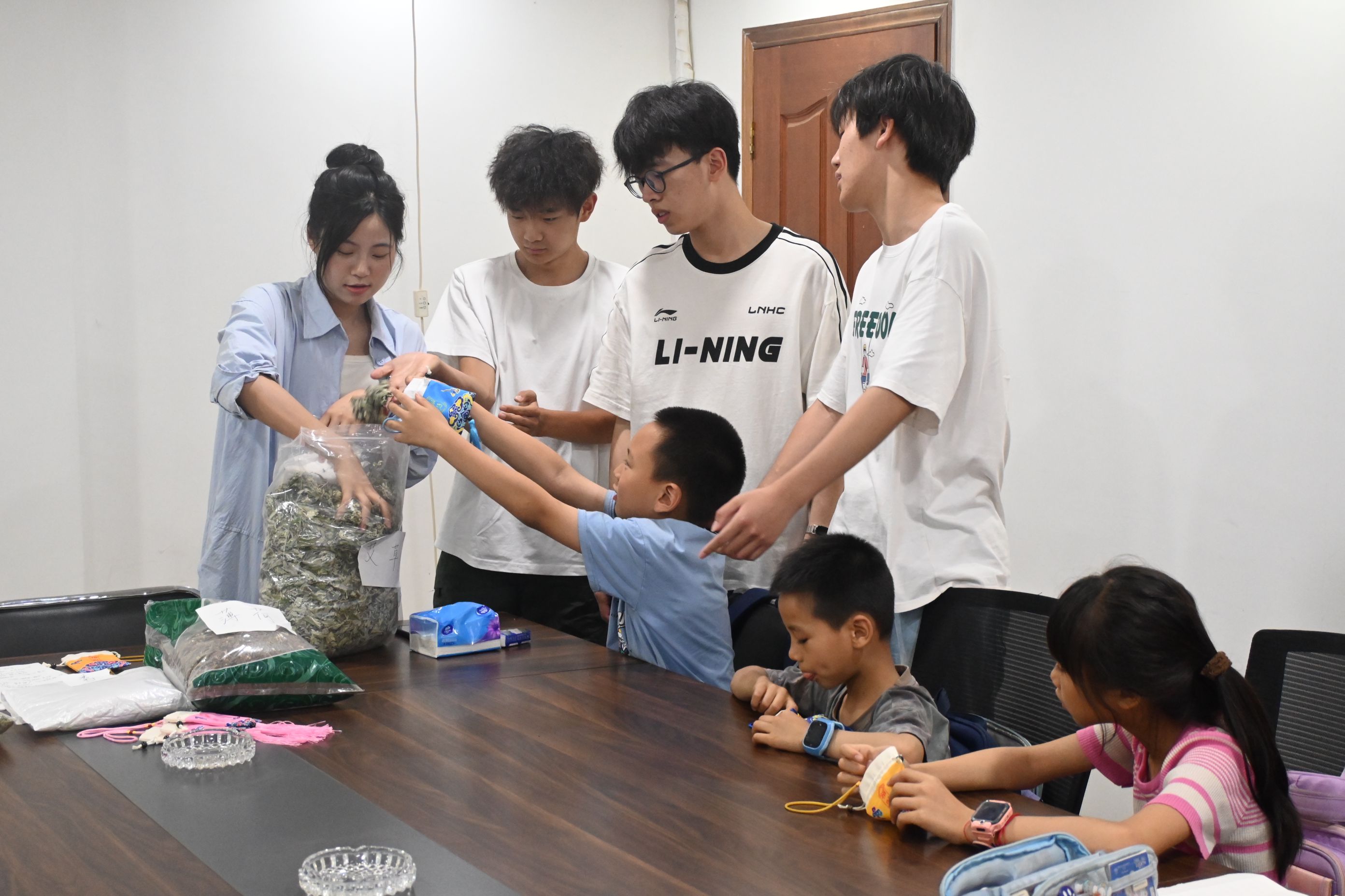 图为小朋友在志愿者指导下,基本完成香囊的制作。