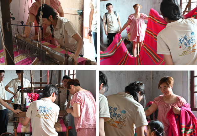 在理论讲解后,李静艳现场示范了织布机的操作技巧,并指导支教队员们上手体验。从经线整理到纬线穿梭,队员们认真跟随学习,亲手操作传统织机,感受每一寸布匹背后的精工细作。“看似简单的动作,实际需要极大的耐心和技巧。”支教队员李清同学感叹道,“这让我们对传统工艺的敬畏之心油然而生。”