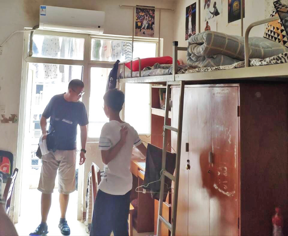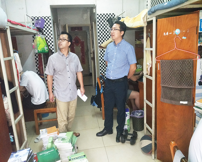 在宿舍里,刘韦副书记和辅导员们亲切询问同学们的假期生活情况,详细了解了大家暑期的思想动态。各位老师对宿舍的安全用电和卫生状况进行了督促检查,提醒大家营造安全温馨文明的社区环境。各位老师还询问了同学们的新学期规划,谈话中帮助大家确立合理目标。