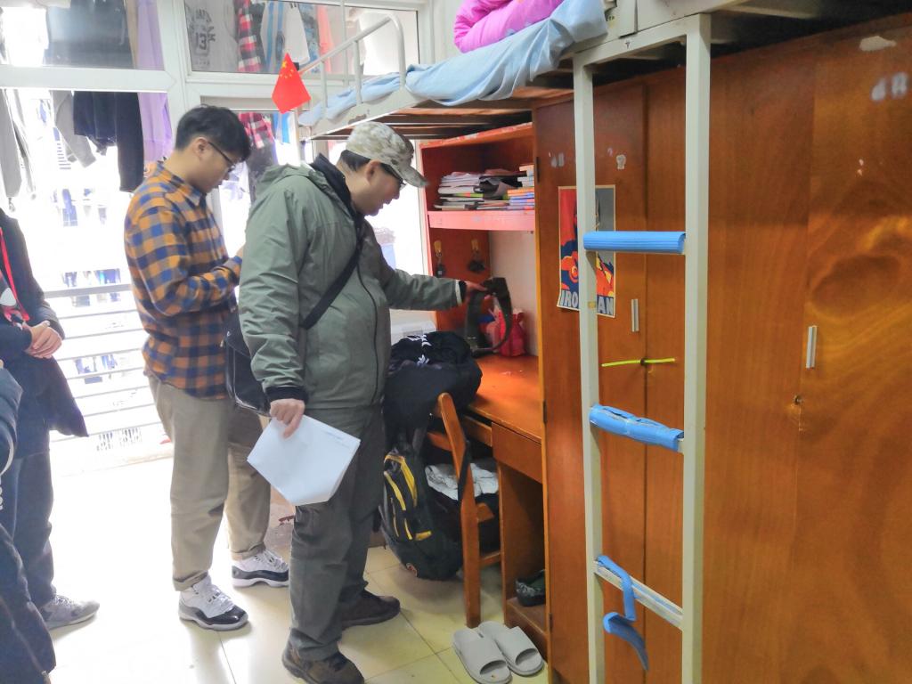 在宿舍,老师们仔细查看了宿舍门锁、窗户等硬件设施,同时还细致地查看了寝室里的水管、龙头、空调等多处细节来确保同学们的安全问题。相关人员对于检查过程中发现的个别问题,认真地做了记录,并汇总向宿管和维修部门反馈。