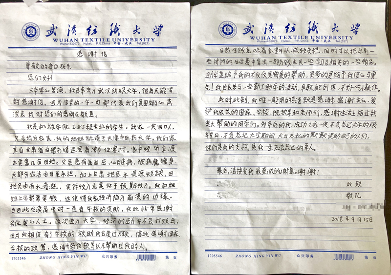 “我感谢中国共产党!党的温暖关怀和爱心人士的慷慨捐助让我没齿难忘,感谢党的帮扶政策,感谢学校领导老师春风般的关爱与帮助,我也绝不辜负学校和老师们对我的殷切期望,一定会努力学习,将来回报祖国和社会。”williamhill英国中文2018级受助贫困学生小小(化名)同学在给学院领导的感谢信中这样写道。