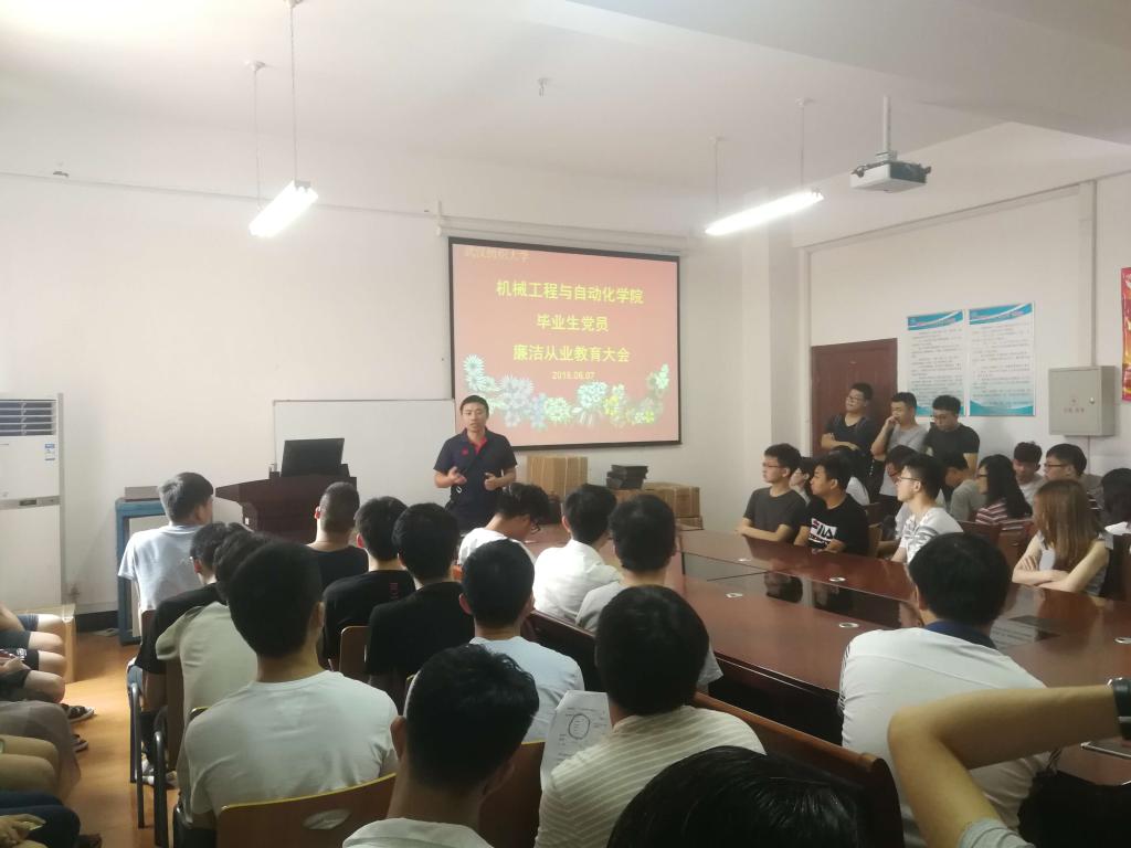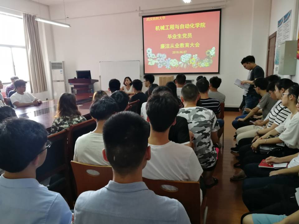 为贯彻落实全面从严治党的要求,增强毕业生党员的廉洁自律意识,6月7日上午,机械工程与自动化学院在8E411召开2018届毕业生党员廉洁从业教育大会。学院党委副书记卫冬妹主持会议并讲话,毕业生辅导员王双喜、梁祥云出席会议并布置相关工作,williamhill英国中文2018届80余名毕业生党员参加了会议。