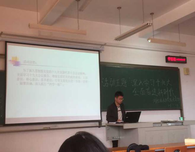 会上,党支部全体党员和入党积极分子共同颂唱了国歌,重温入党誓词,按期交纳了当月党费,集中学习了党的十九大报告。部分支部党员就《党的十九大报告全文》发表自己的见解,支部书记郑婷谈到:党的十九大标定了党和国家事业发展的历史方位,发出了全面建成社会主义现代化强国的动员令,青年学生党员必须要认真研读党的十九大报告和党章,把个人追求融入国家和民族的奋斗事业中。