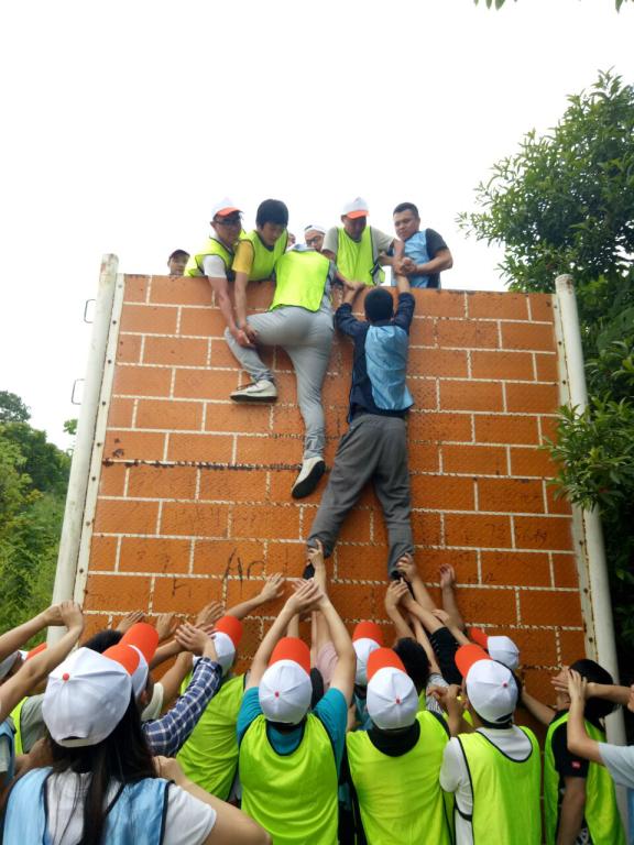 最后压轴的活动是“毕业墙”,每个人都必须徒手翻阅4米多的高墙,这是一个依靠团队力量才能完成的挑战。同学们有条不紊的推举团队领导者,坚决执行团队决定的方案,身体健壮的同学都自告奋勇担当人墙,最终30多名队员在6分钟内全部翻阅高墙。这是团队凝聚力的绝佳体现,是勇气与智慧的完美融合。