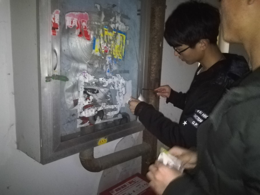 下午六点,机械志协的成员们分成两组,分别对阳光校区4栋寝室楼和8栋教学楼进行清理。工作量看起来不大,但真正做起来却并不简单。为了工作更加效率,个子高的同学负责高处的宣传单,个子矮的则清除低处的“牛皮藓清除”。用刀刮掉墙上的小广告,用毛巾擦掉桌子上的浆糊,为了看起来干净,不得不擦好几遍。经过一个多小时的清洁,门窗、墙壁、书桌上的“牛皮藓”少了许多。