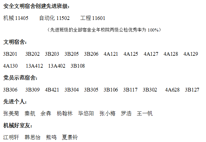 梁祥云老师宣读了表彰决定。在2016年安全文明宿舍创建及宿舍文化节等各项活动中,涌现了一批先进集体及个人,学院分团委决定授予机械11405班等3个班级为“安全文明宿舍创建先进班级”荣誉称号,授予3B201等14间宿舍为“文明宿舍”荣誉称号,授予3B306等10间宿舍为“党员示范宿舍”荣誉称号,授予张美菊等8人为“安全文明宿舍创建先进个人”荣誉称号,授予江明轩等4人为“机械好室友”荣誉称号。