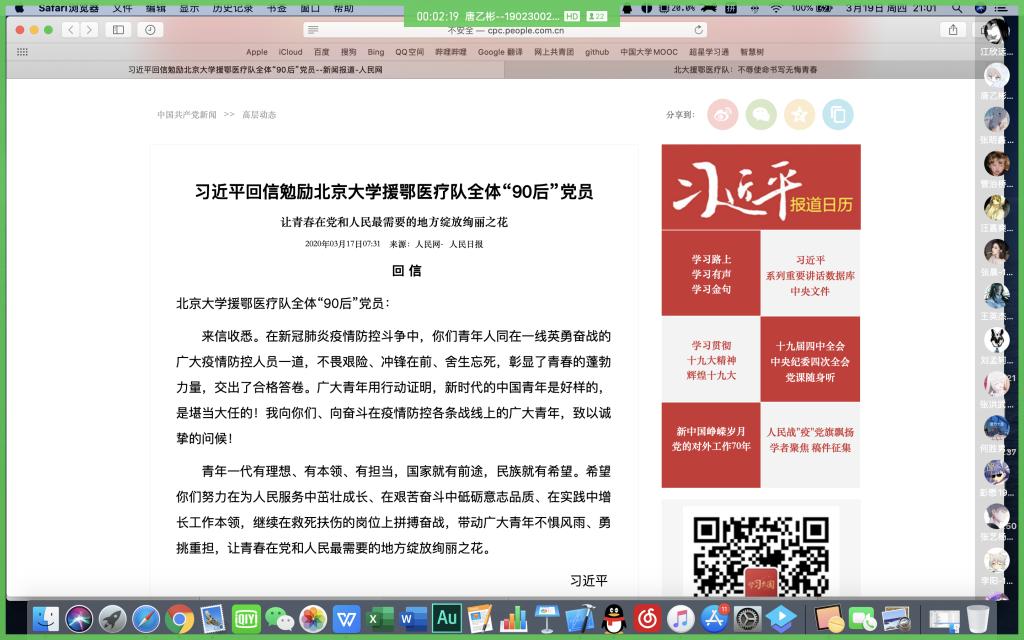 近日,根据团省委、校团委统一部署安排,为进一步学习习近平总书记给北京大学援鄂医疗队全体“90后”党员回信精神,强化团员青年的责任担当,williamhill英国中文组织开展了“学总书记回信,话青春担当”线上主题团日活动。全院54个团支部精心策划、认真组织,全体团员青年线上积极参加,氛围浓厚。