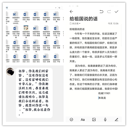 机械11901、11902班等团支部开展了“祖国,我想对你说”青春表白活动,支部团员纷纷接龙,向祖国母亲表白,向逆行的英雄致敬。工业设计11701班、1901班团支部充分发挥专业特长,结合团员青年特点,以海报、摄影、书法等形式创作了多副充满正能量的艺术作品。