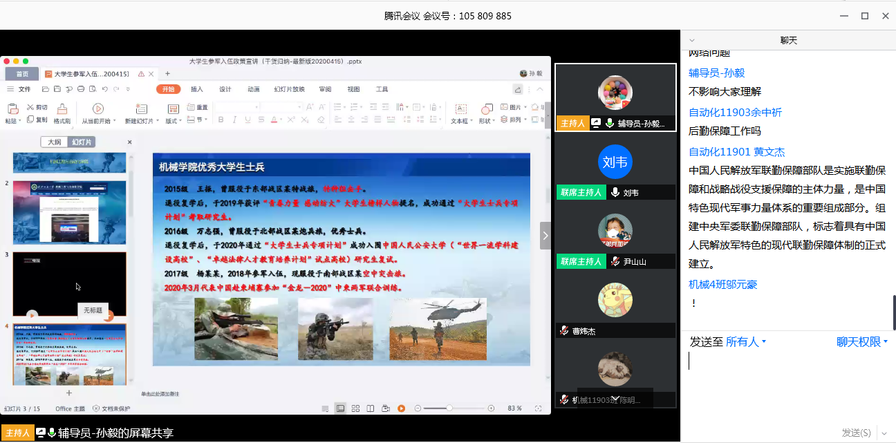 尹山山,机械11703班学生,曾服役于陆军某部,两年的军旅时光,他驻扎在祖国西南边陲,将青春印刻在漫长的边境线上。会上,尹山山同学和辅导员老师通过交流访谈的形式,在线为大一新生介绍了军旅生活的点滴与感受。参军期间,他兼任连队文书,在完成军事训练的同时,协助连队主官准确、及时的完成与上级部门的文件传输。正是由于部队对他的全面培养,让他养成了严谨、高效、务实的工作作风。当谈及在解放军烈士陵园与抗战老兵相遇的故事,他表示,当听完老兵讲述当年的战斗故事后,他的眼眶湿润了,那一刻,他深深地感受到了作为一名边防战士的使命与责任,从而也更加坚定了他刻苦训练,敢打敢拼的坚强意志。